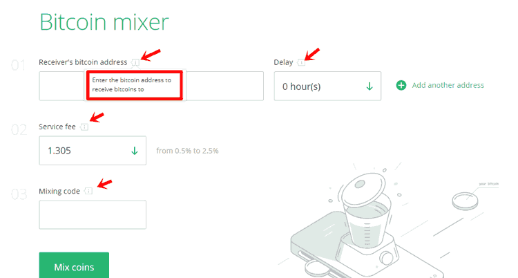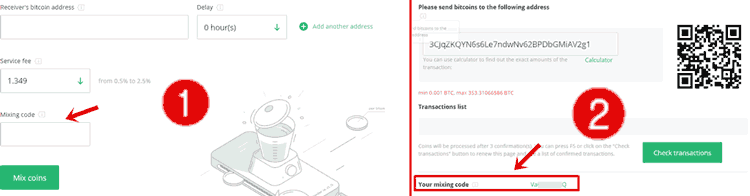 Вариант кода микширования можно увидеть на двух страницах blender.biz. Попав на первую страницу, вы начинаете свой микс. Здесь вас попросят ввести mix code (изображение -1). Или на последней странице микса, где платформа дает вам адрес депозита (изображение-2).