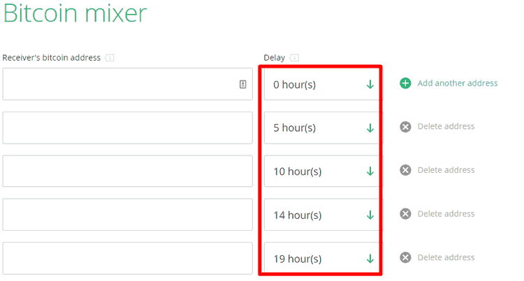 У нас в резерве много биткойнов, это позволяет нашим клиентам совершать операции независимо друг от друга. Более того, вы можете установить задержку для каждой операции, чтобы смешивать монеты еще лучше. Ваши монеты будут отправлены соответственно этим задержкам.