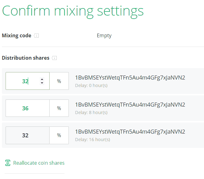 Распределенные доли - это сумма средств, отправленных на каждый отдельный выходной адрес. Например, если вы указали 3 дополнительных адреса, сумма средств, получаемых каждым адресом из общей суммы, является долей распределения.