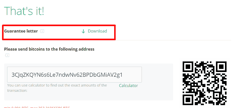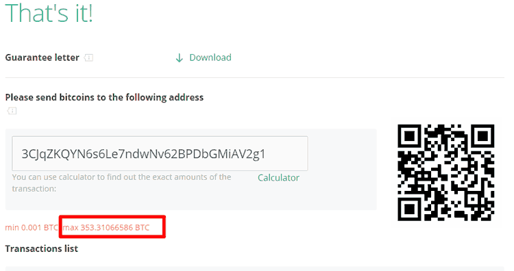 Обращаем ваше внимание, что минимальная сумма для смешивания составляет 0,001 BTC. Если вы случайно отправили меньшую сумму, обратитесь в нашу службу поддержки по электронной почте с прикрепленным гарантийным письмом.